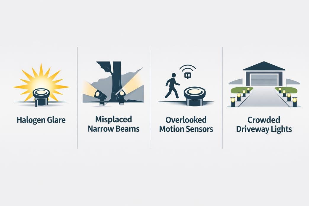 → Common Pitfalls: Avoid harsh halogen glare, misplacing narrow-beam accents, overlooking solar motion sensors, and crowding drive-over lights too close to the driveway surface.
